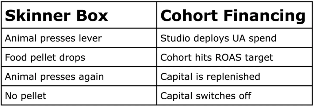 For studios, cohort financing prevents the catastrophic mistake of scaling into broken unit economics. When ROAS drops below the benchmark target, capital stops flowing immediately (ok probably with a little wiggle room at lender’s discretion). You can’t press the lever harder and make pellets appear. The mechanism forces you to stop, diagnose what broke, and fix it before you can scale again. Fix the creative, find new audiences, adjust bidding strategy. Only when performance recovers does capital return.